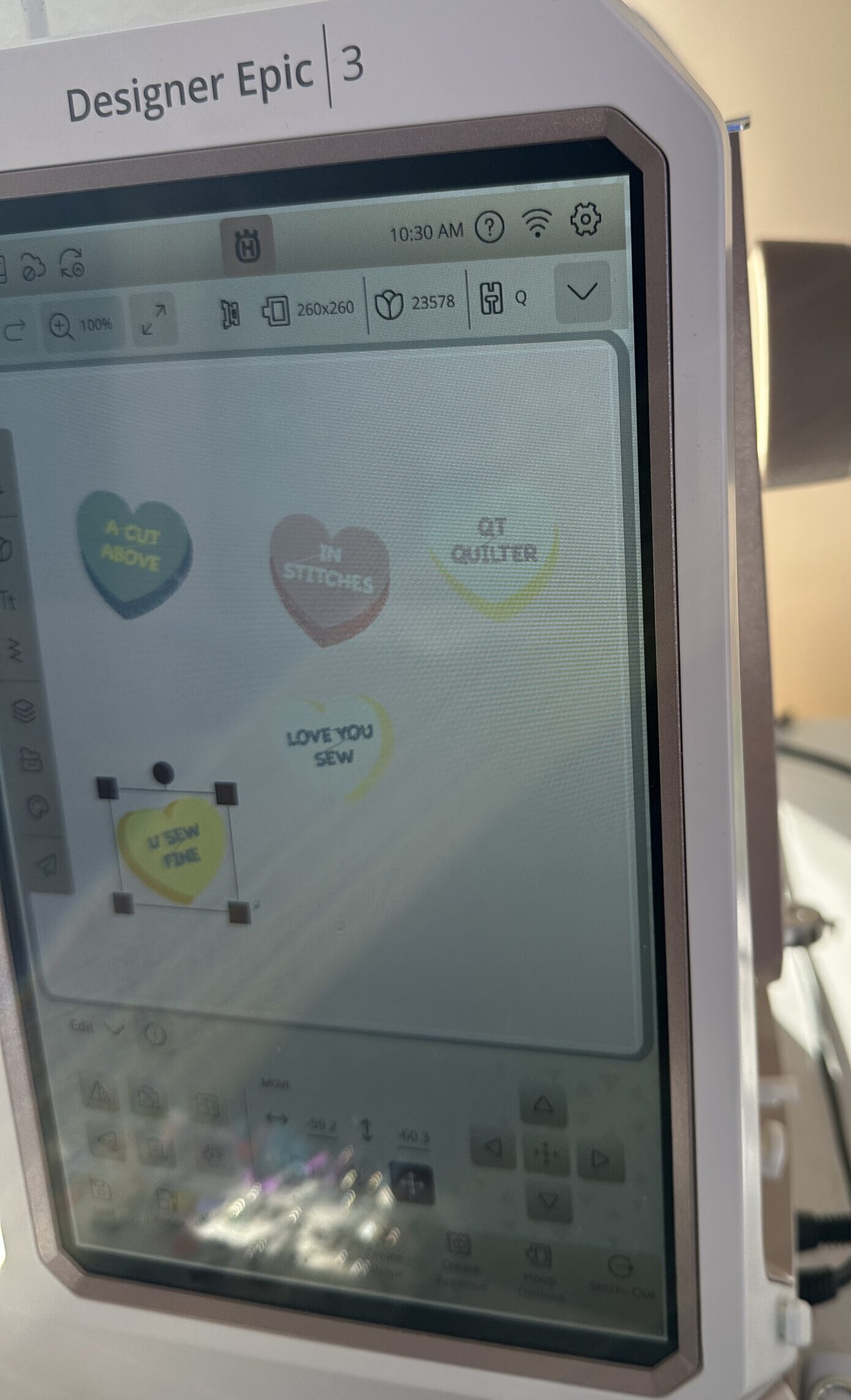 If you don’t have embroidery software, import each desired design into the machine and arrange them on screen. Again, make sure there is ample space between designs for a pleasing arrangement.