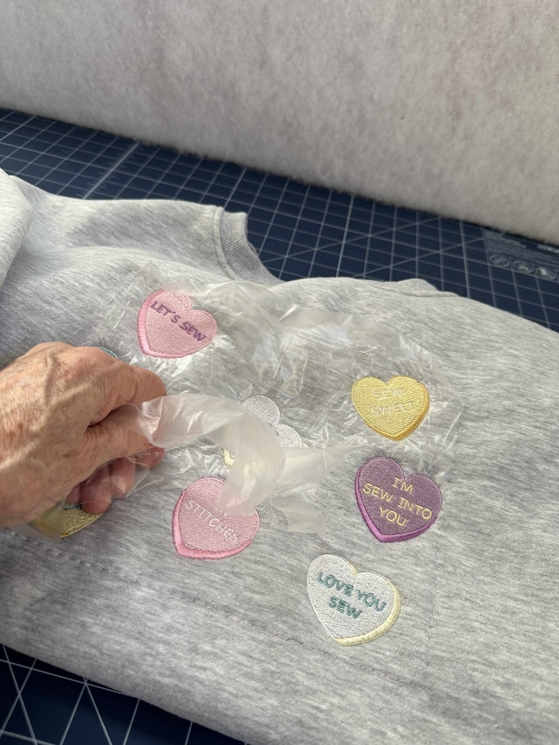 Then, remove the Soft ‘n Sheer from the hoop, releasing the sweatshirt.