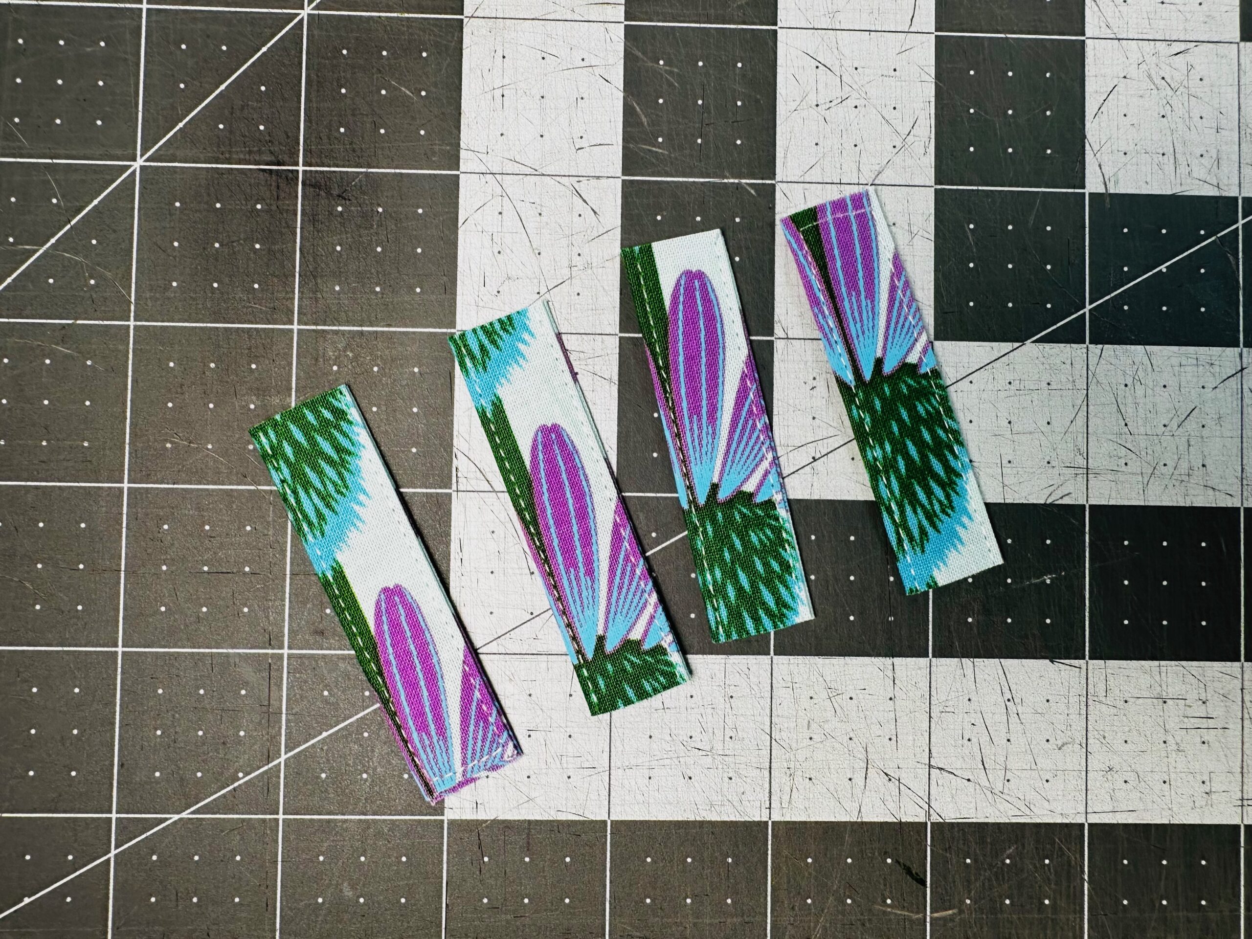 Follow suit to stitch the handles as per the Handle Connector rectangle: First, fold each rectangle in half lengthwise with wrong sides together; press to set the foldline. Then, unfold the rectangles and fold each long edge to meet at the center foldline; press again. Next, fold each rectangle in half along the first foldline to enclose the long raw edges. Topstitch each long edge.