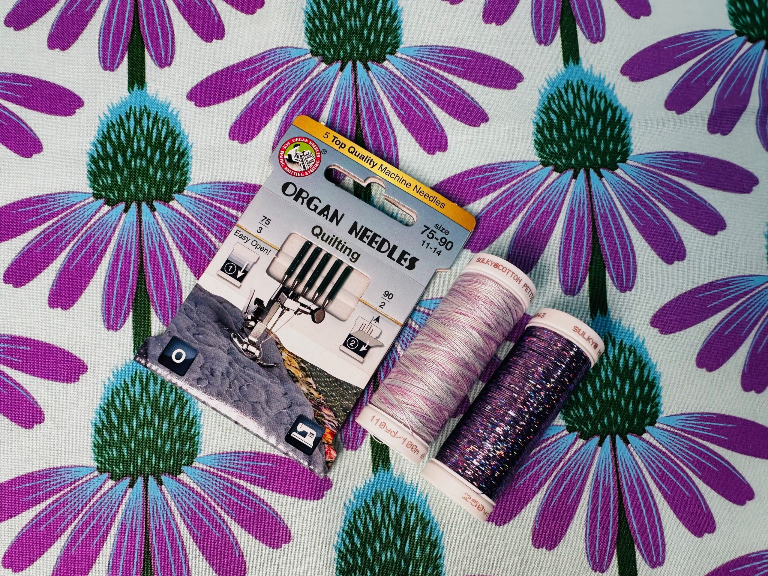Once you’ve determined the type of quilting you plan to do on the tote Exterior and Pocket pieces, decide which thread types and weights to use for the quilting. Choose from the following thread and needle combinations that come in the kit. You may want to use all of the following or choose one or two you like best. Note: The 50 wt. Cotton Thread is intended for the tote construction, too.