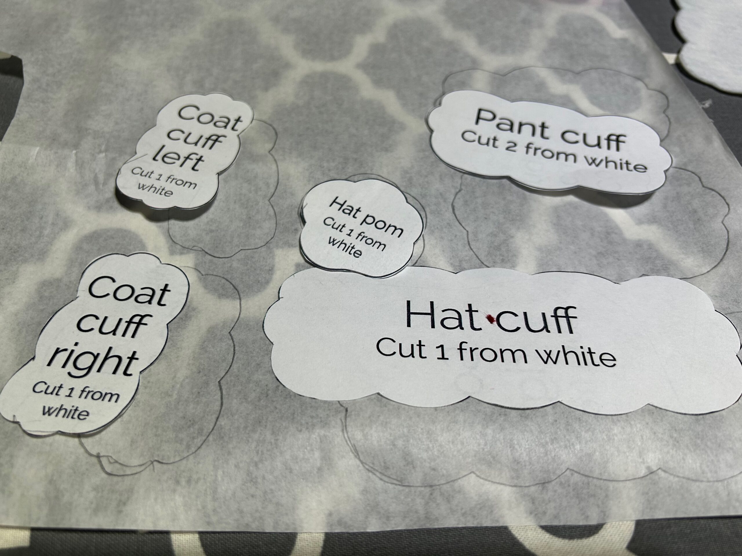 Peel the paper backing away from each fused piece. Arrange the elements, including the trim on the coat, suspenders, sock feet/heels, onto the corresponding Felty piece.