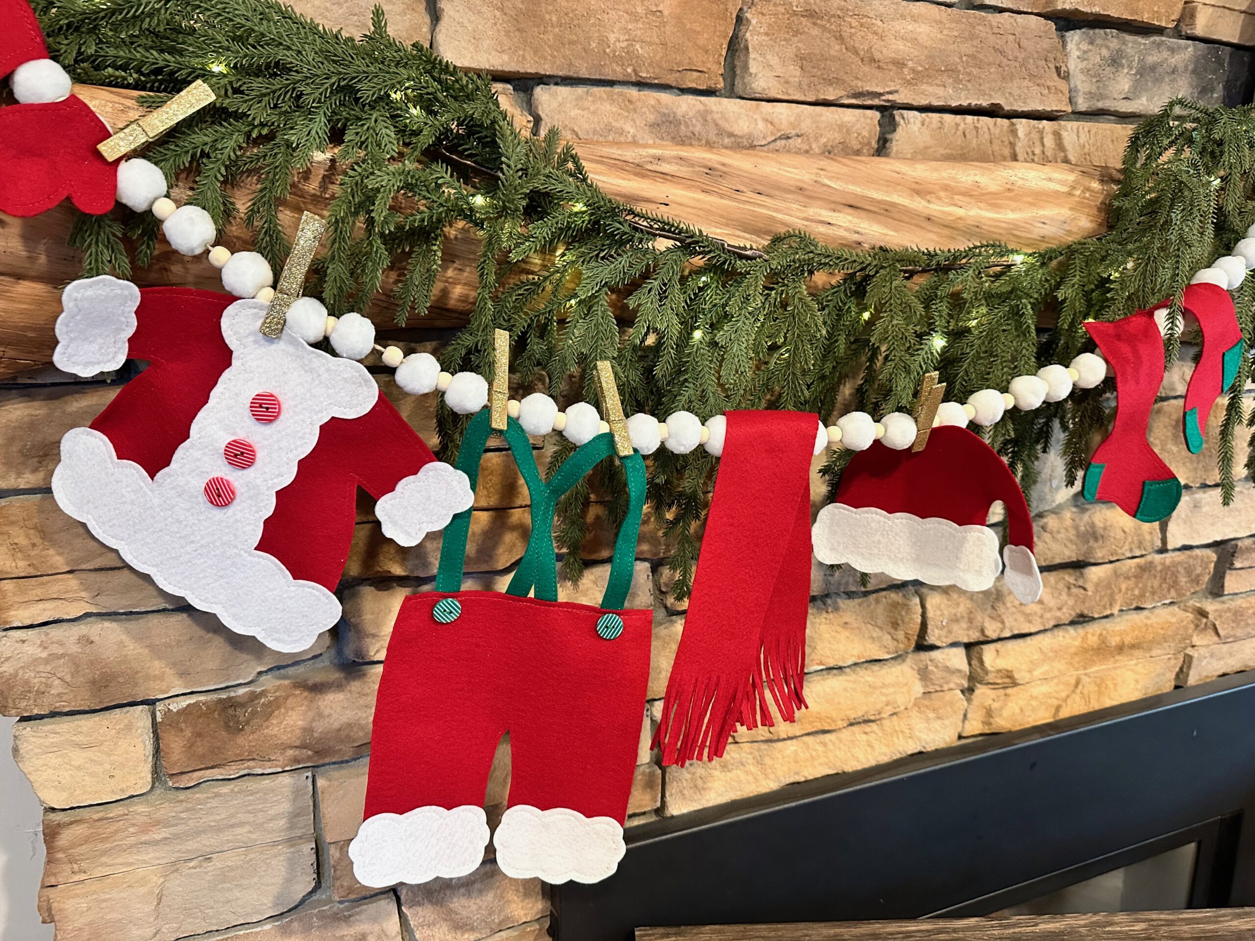Using decorative clothespins, hang each piece of Santa’s wardrobe to an existing garland or clothesline.
